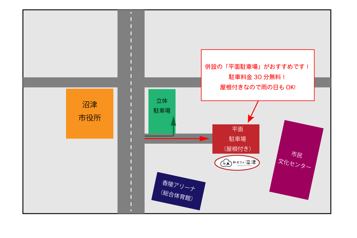 お車で和カフェ沼津をご利用のお客様は、併設の駐車場のうち「平面駐車場」が便利です。